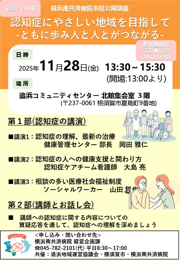 この度、地域の皆さまの健康づくりに貢献することを目的とし、追浜地域運営協議会、横須賀市と市民公開講座を共催いたします。 認知症に関する内容について、当院認知症ケアチームが講演いたします。 詳細は下記のポスターをご参照ください。皆さまのお越しをお待ちしております。