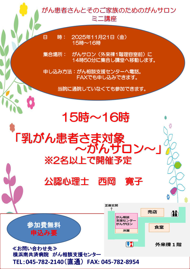 「がん患者さんとそのご家族のためのがんサロン ミニ講座(11月)」開催のお知らせ