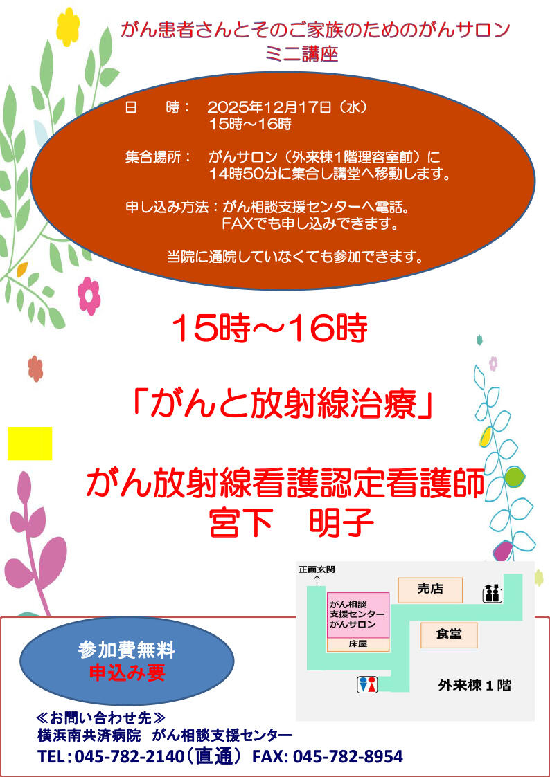 「がん患者さんとそのご家族のためのがんサロン ミニ講座(12月)」開催のお知らせ