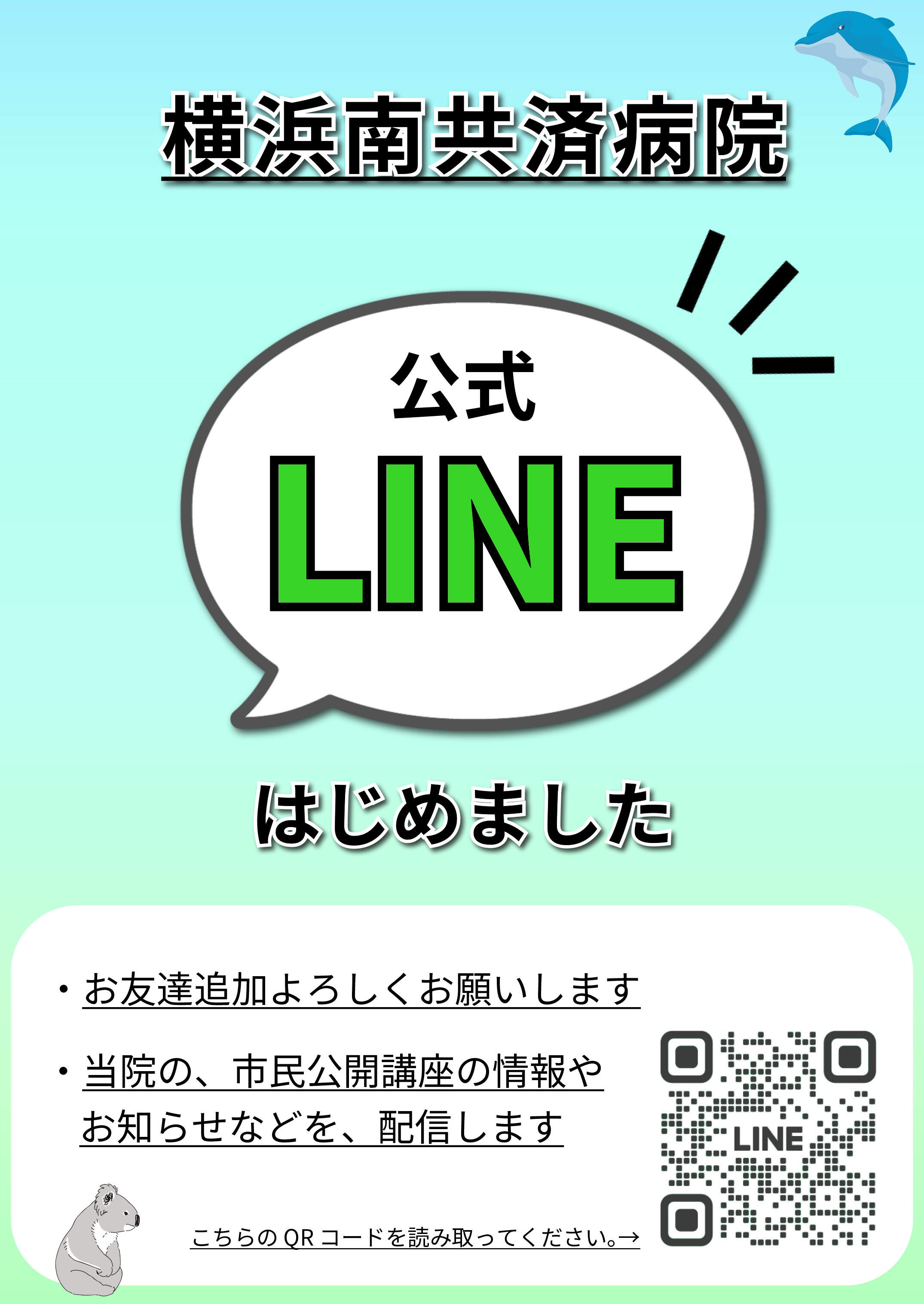 この度、横浜南共済病院のLINE公式アカウントを開設いたしました。 病院の、イベント情報やお知らせなどを配信いたします。 是非、「お友達登録」をお願いいたします。