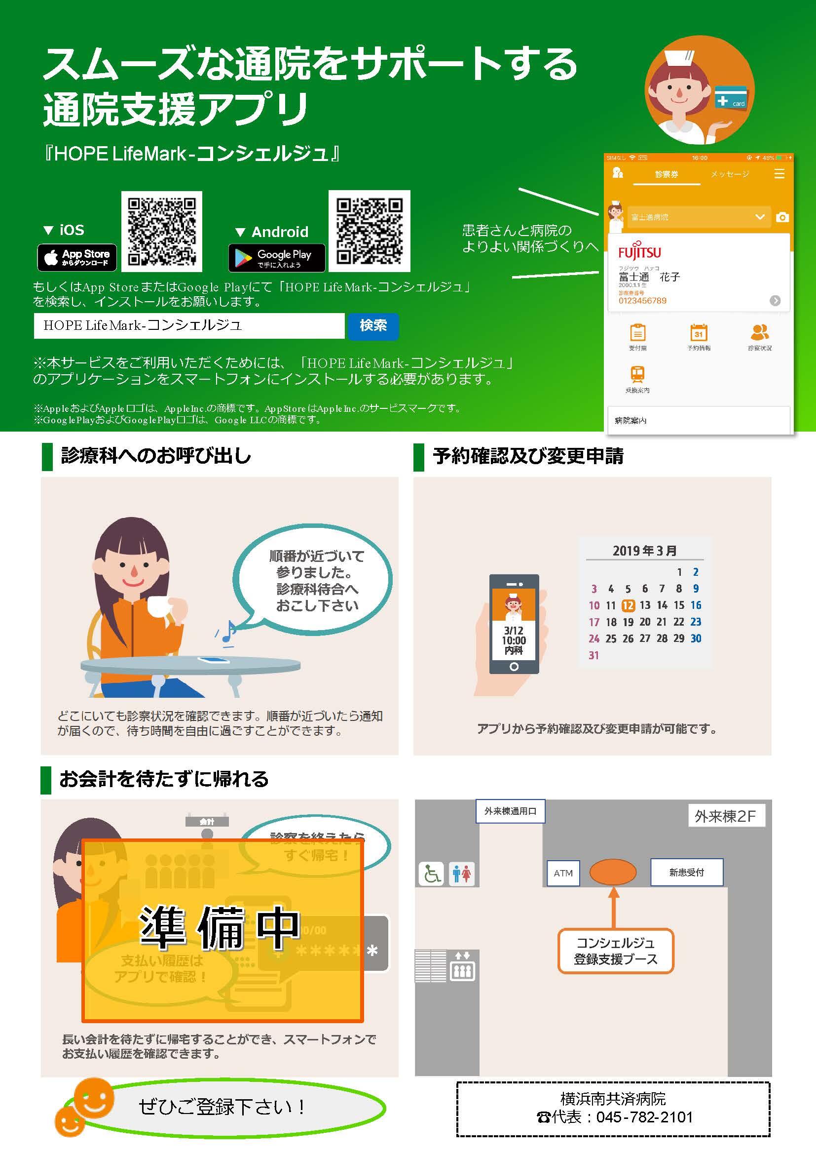 令和8年3月23日より、通院支援アプリ「HOPE LifeMark-コンシェルジュ」を導入いたしました。 ご登録いただくと、予約状況確認及び予約変更申請、予約通知(リマインド)、診療科への呼び出し通知などのご利用が可能となります。