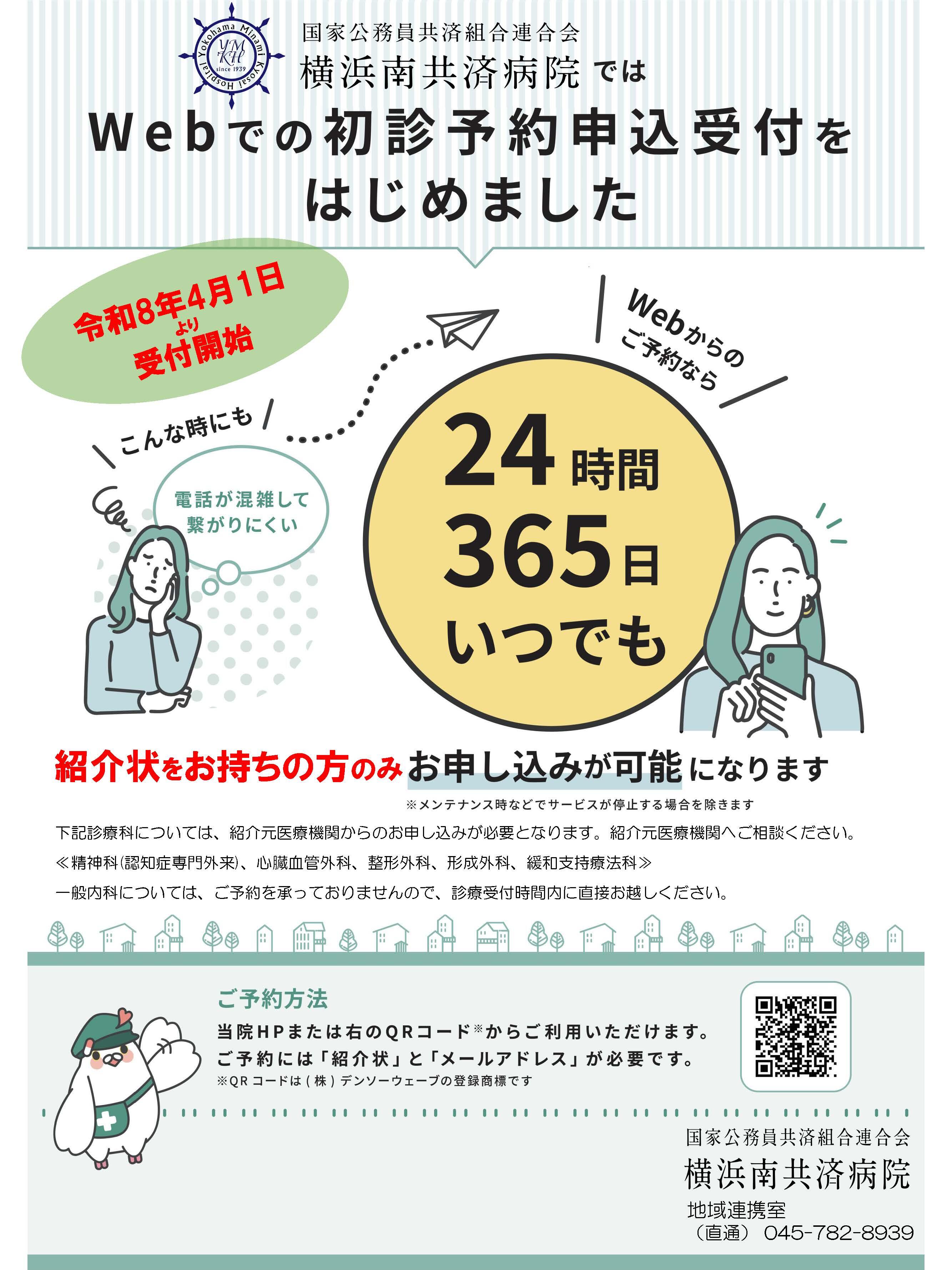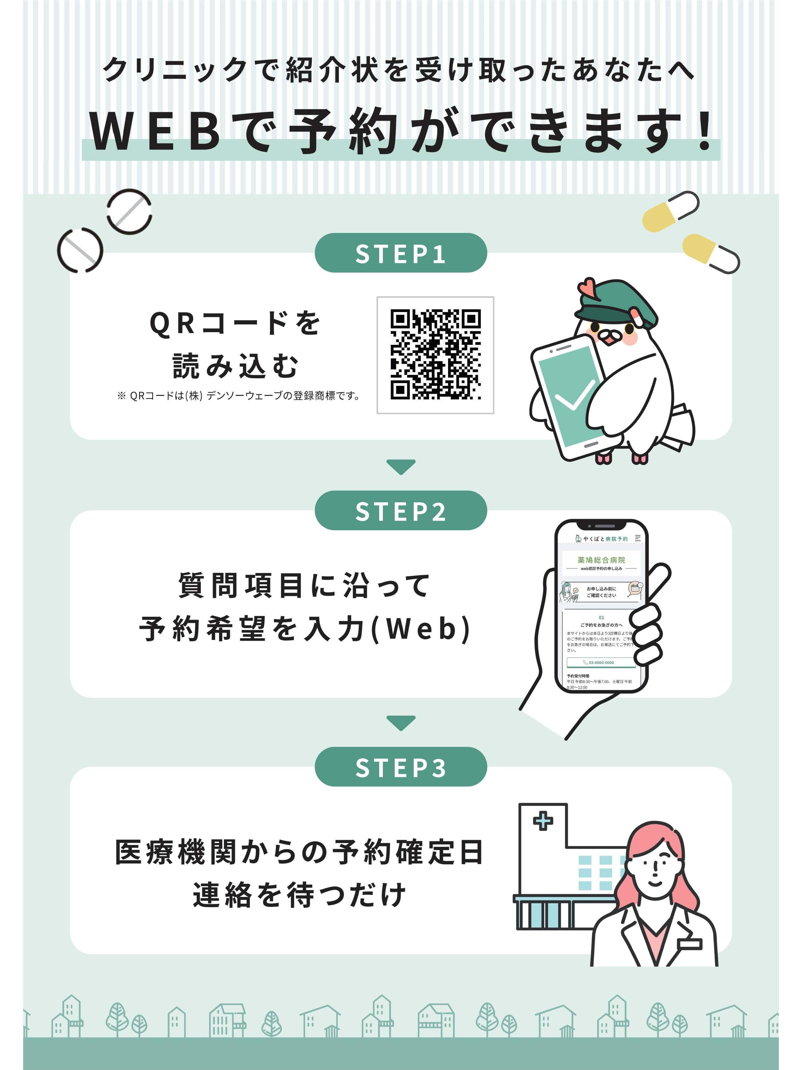 令和8年4月1日より、WEB初診予約システム「やくばと」を導入いたしました。 これにより、スマートフォンやパソコンから24時間365日いつでもお申し込みが可能となりますので、ぜひご利用ください。 ※一部診療科については、医療機関からの予約申込となります。