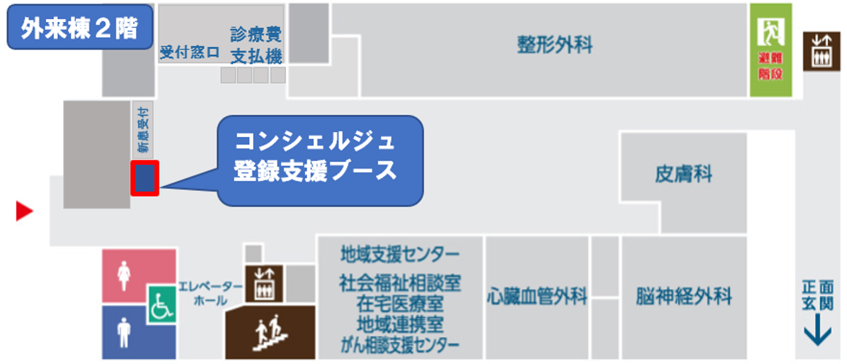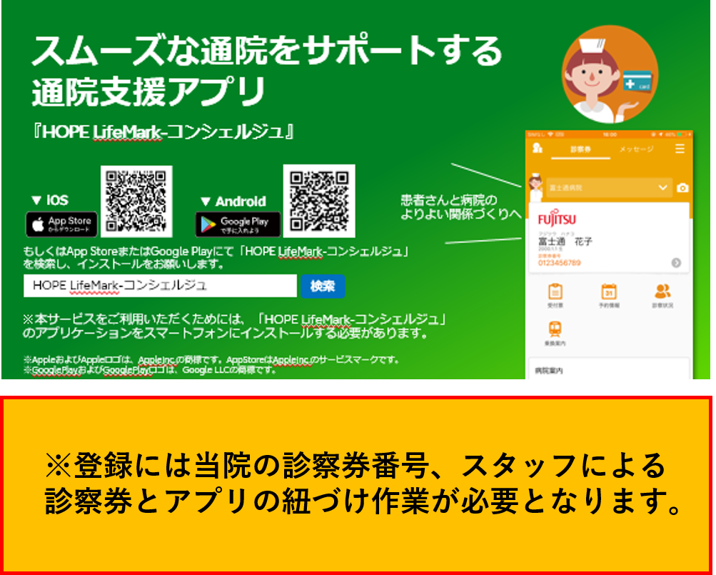 A.アプリをインストールするだけでは利用できません。初回登録時には、当院で登録が必要となりますので、診察券・マイナンバーカードなど(本人確認書類)をお持ちになり「コンシェルジュ登録支援ブース」 までお越しください。