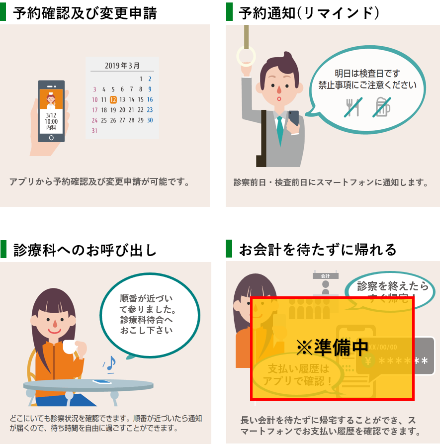 本アプリでは電子カルテと連携し、予約状況確認及び予約変更申請、予約通知(リマインド)、診療科への呼び出し通知などが可能です。