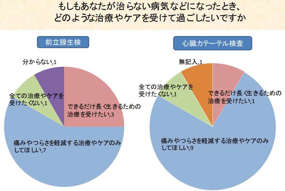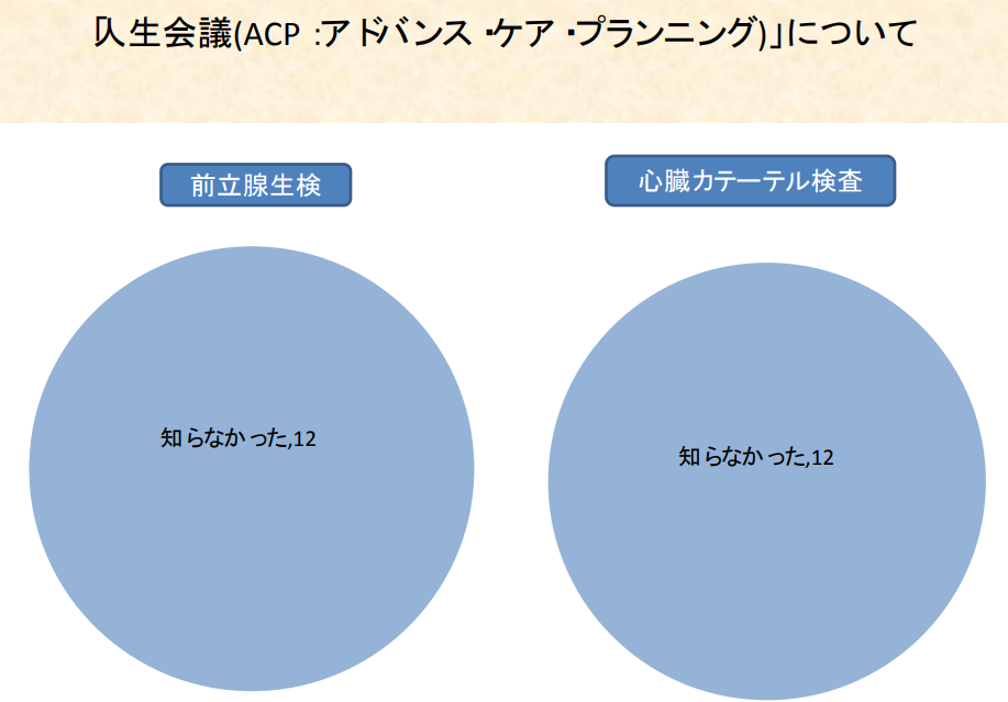 当院で検査を受けられた患者さんへのアンケート結果です。 これまでは「人生会議(ACP)」という言葉をご存じない方がほとんどでしたが、いざ質問をしてみると、ご自身の希望について多様なお考えを持たれていることがわかりました。